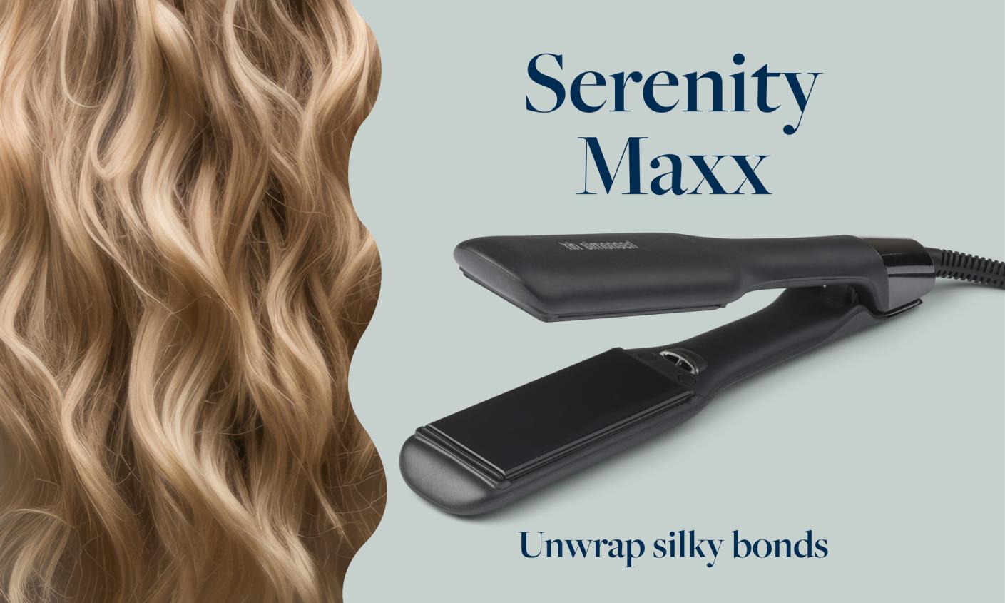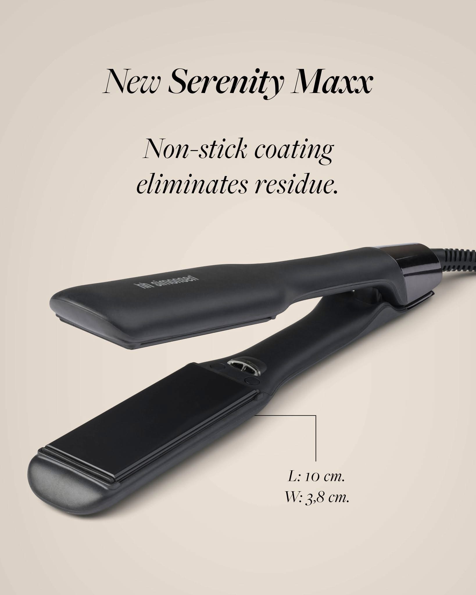 Dank der extrabreiten Platten (38 x 100mm) eignet sich Serenity Maxx besonders für langes und dickes Haar – so können Sie mehr Haar auf einmal stylen und in kürzerer Zeit seidig-glatte Ergebnisse erzielen.